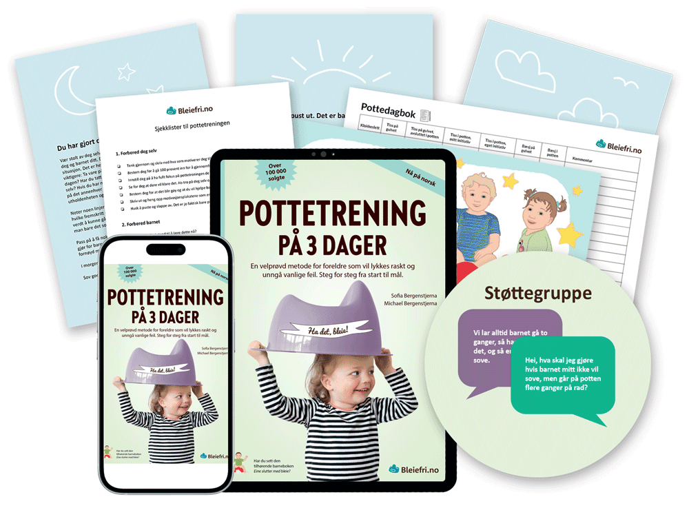 Mange har bedt oss om å skrive ned tipsene og rådene våre, så de kan følge samme opplegg med sine barn. Og slik ble ideen til denne boken født. Vi innså at det som mangler i dag, er en konkret plan foreldre kan følge for å hjelpe barna å slutte med bleie. Vi oppdaget også at det er mange myter og masse feilaktig informasjon om pottetrening i omløp i dag. Kombinasjonen av alt dette gjorde at vi følte vi hadde fått et viktig oppdrag, og vi bestemte oss for å skrive en bok som kunne spre vår innsikt videre.